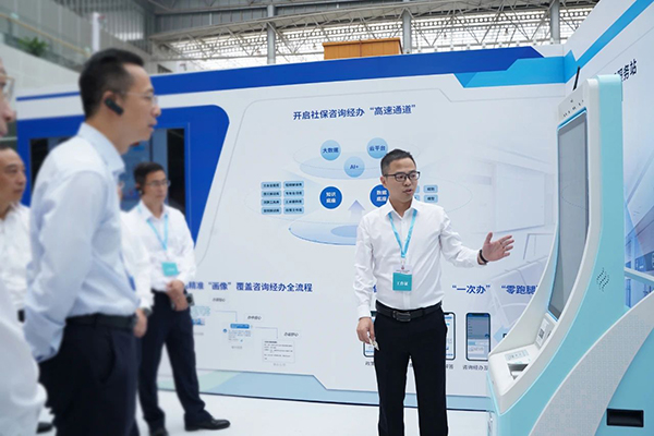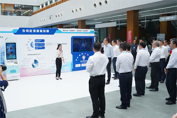 ▲省、市领导参观东莞社保智能客服展区,观看“一卡通”便民服务站现场演示