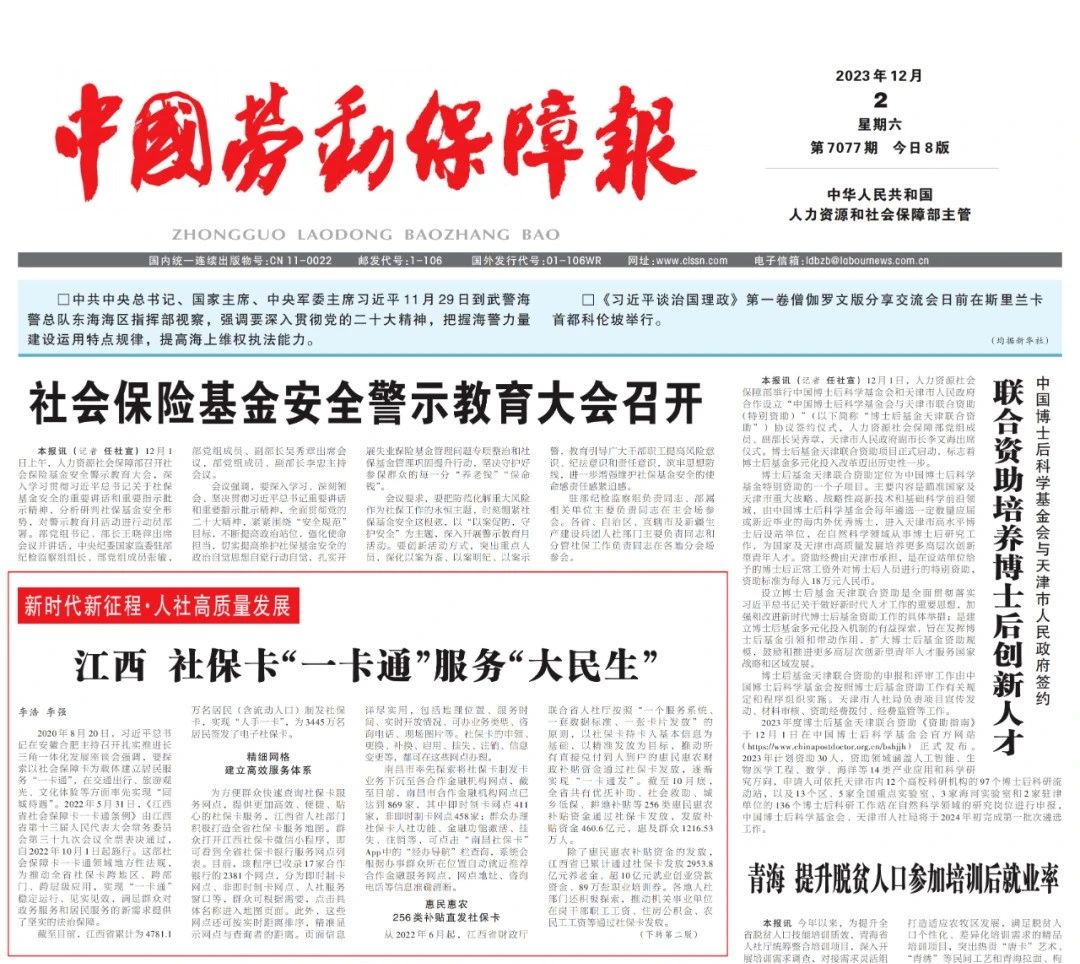 12月2日,中国劳动保障报首版刊发了《江西 社保卡“一卡通”服务“大民生”》一文,详细报道江西以社会保障卡为载体建立居民服务“一卡通”的惠民实践。作为江西省社保卡“一卡通”综合服务商,bw必威西汉姆联官网以应用赋能、服务赋能、数据赋能,助力江西不断拓展居民服务“一卡通”场景应用,让广大群众共享数字化发展成果。
