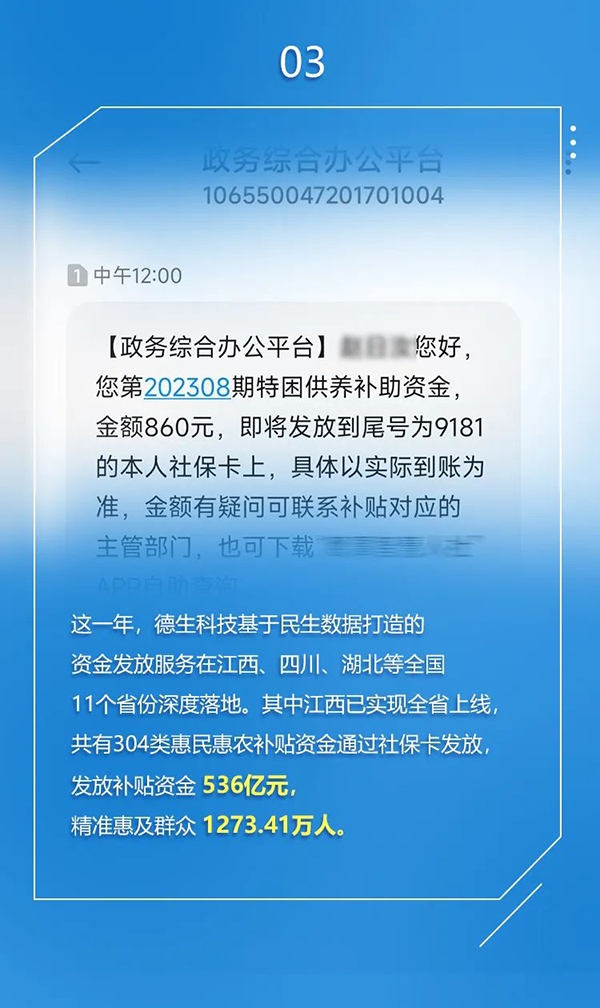 2023年,居民服务一卡通场景建设全面开花,民生数据产品如雨后春笋涌现,数字化公共就业服务助力托举稳就业前行,便民服务站搭载大模型数字人惠及群众,信用就医无感支付打造就医缴费“ETC"高速通道,资金发放让关怀妥帖到达群众口袋,数字供销落地签约助力乡村振兴……