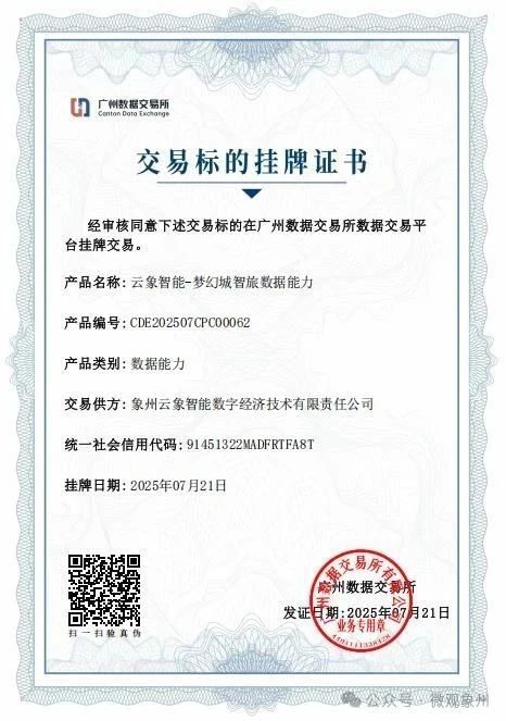7月21日,象州云象智能数字经济技术有限责任公司的《云象智能-梦幻城智旅数据能力》数据产品正式在广州数据交易所挂牌上架,成为象州县首个上架的数据产品,实现来宾市数据要素市场化进程“零的突破”。