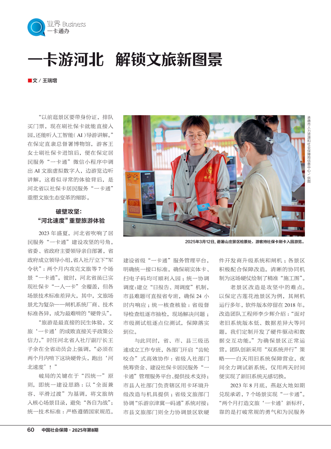 “一卡通”建设,“通”是基础、“用”是关键。河北省选定保定市为“一卡通”文旅场景深度应用试点,推动社保卡从“能入园”升级为“体验优”。这场试点不仅催生了AI导游、虚拟现实(VR)景区等新服务,更通过数据赋能重构了文旅产业运营逻辑。