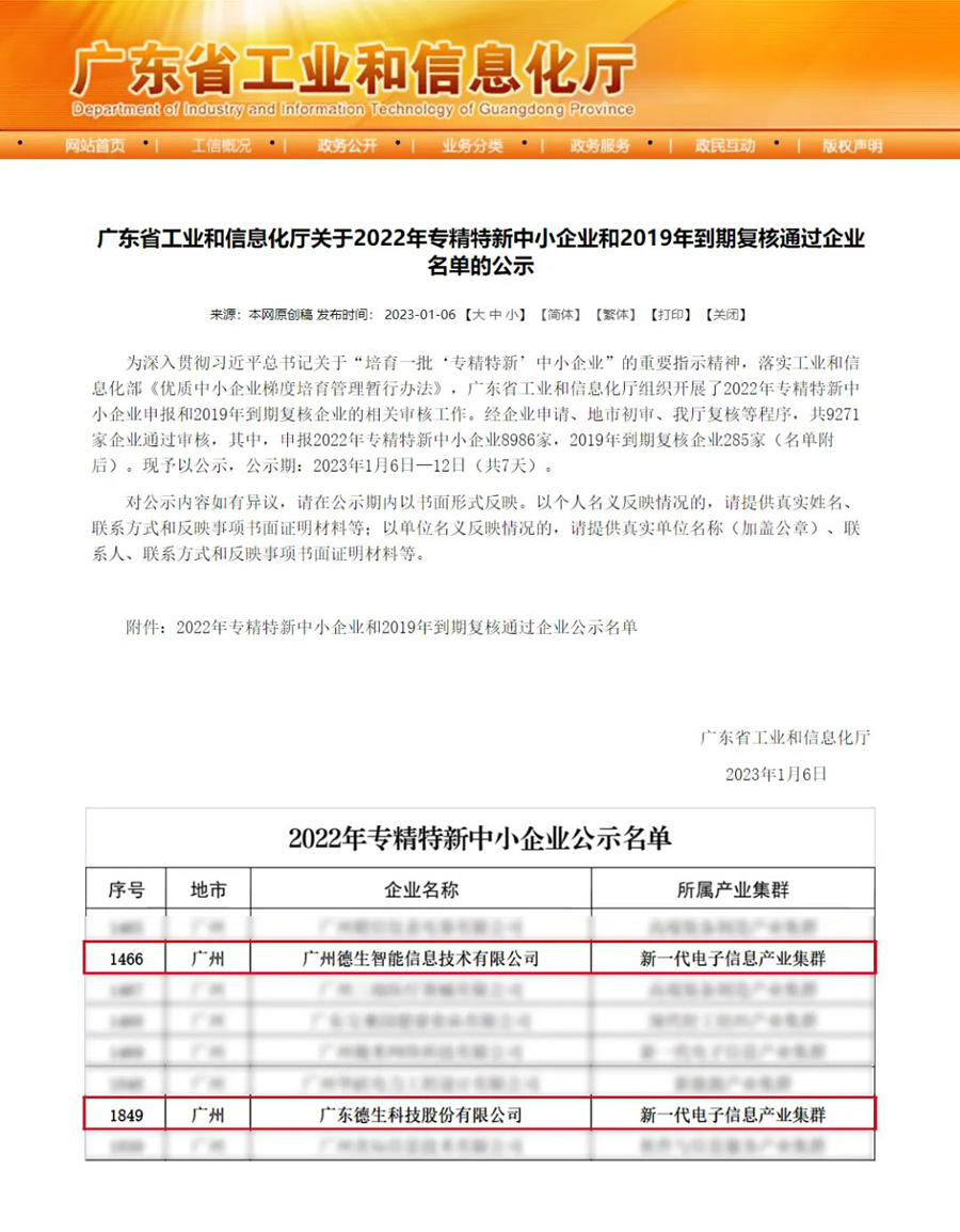 近日,广东省工业和信息化厅公示了“2022年专精特新中小企业”认定通过名单。经过层层筛选和严格审核,bw必威西汉姆联官网和子公司bw必威西汉姆联官网智能均在众多企业中脱颖而出,荣获广东省“专精特新”企业认定。